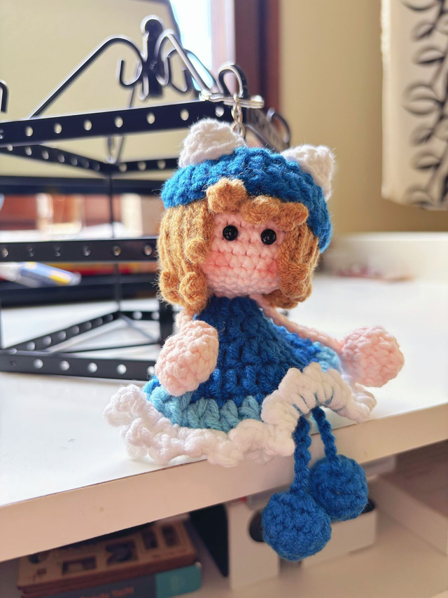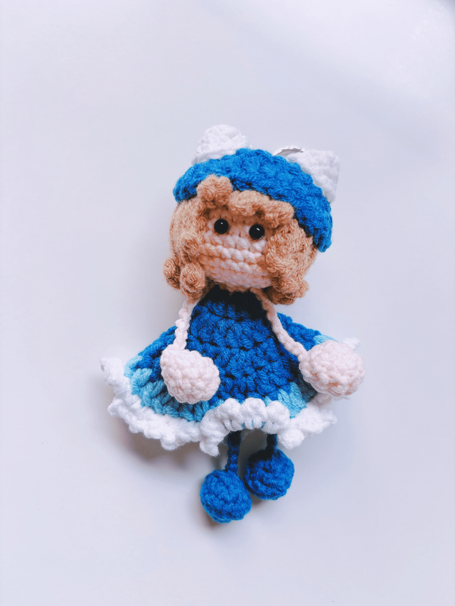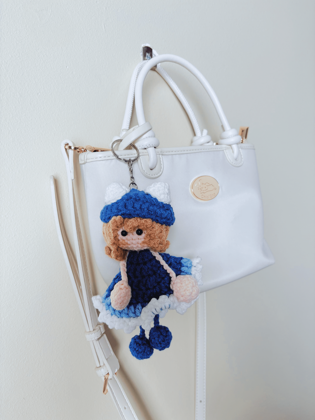 An adorable crochet bag charm inspired by the Finnish flag colors, blue and white. It features a sweet Finnish girl wearing a cute cat hat — the perfect little accessory to add a touch of charm to your bag.